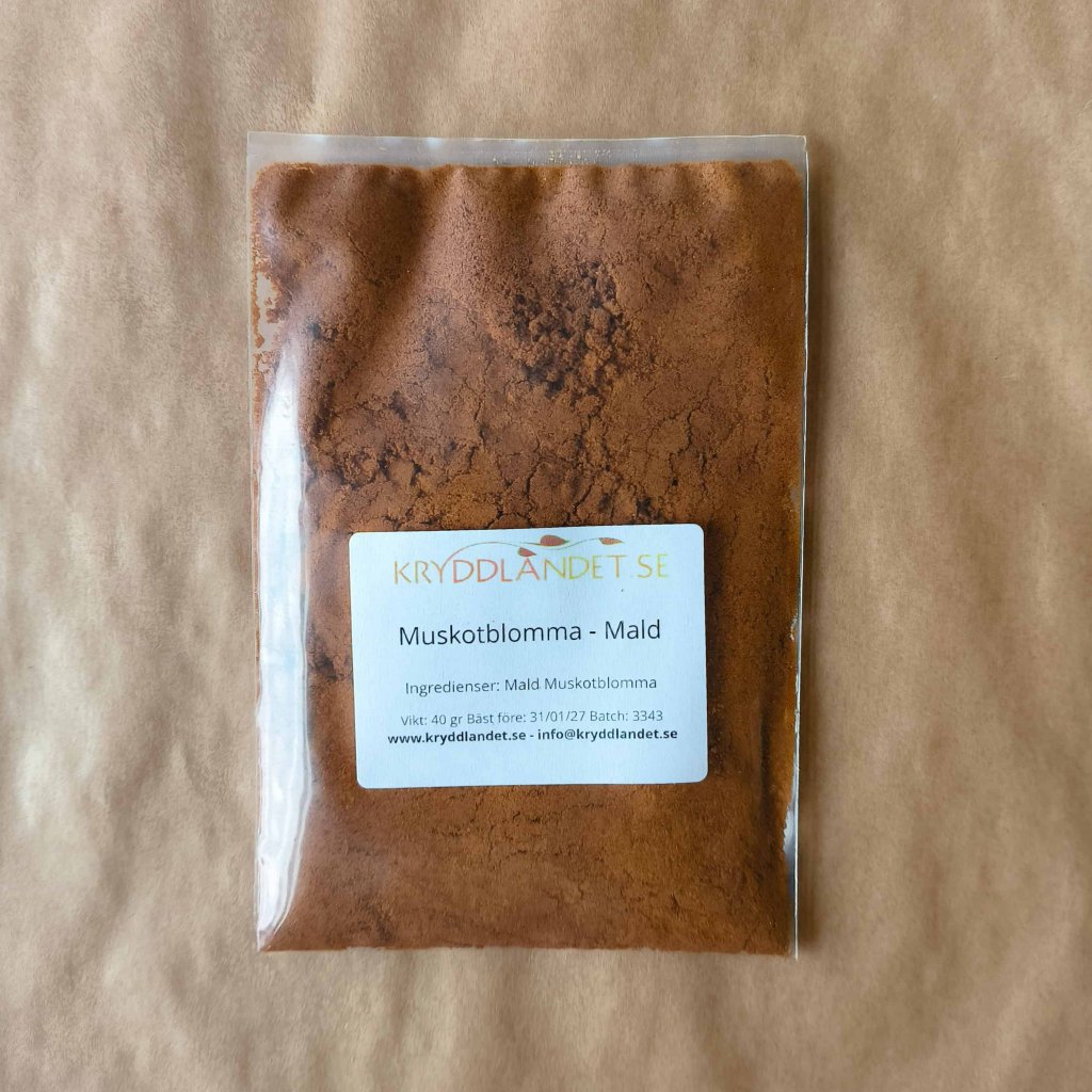 Muskotblomma är det innersta skalet som omger muskotnöten (som också finns i Kryddlandets sortiment!). Muskotblomma, till skillnad från muskotnöt, är förutom konsistensen - smaken! Muskotblomma ger en dovare smak som inte är lika distinkt, med inslag av peppar och lite bittert. Muskotblomma är överlag inte lika intensiv i smaken som hel muskot. Dess unika smakkombinationer gör muskotblomman till en bra ingrediens till inläggningar - som pressgurka exempelvis eller till fisk och egen korv.