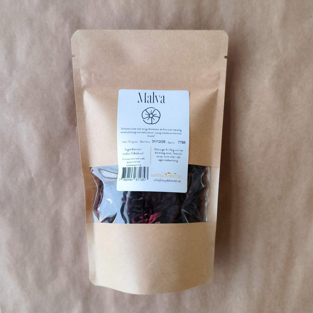 Malva är ett rent ört te som består av hibiskusblomblad (malva). Bladen bryggs som te som får en vacker röd-violett färg och blir sötsyrligt och välsmakande med mycket toner av blommighet. Malva går också att använda till mycket annat, inte minst för dess naturliga färg-egenskaper. Kryddlandets malva finns också i storpack.