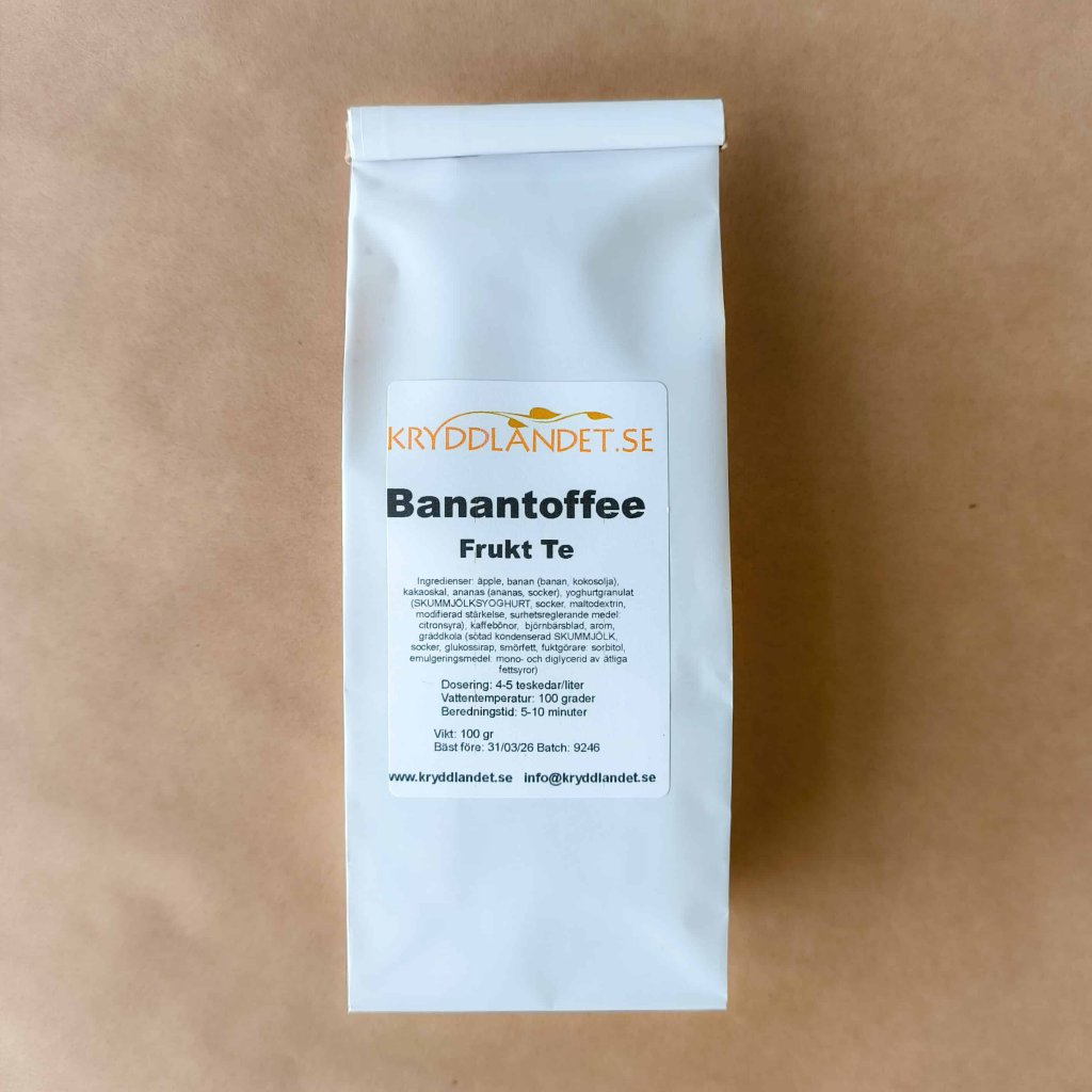 Kryddlandet är Sveriges största krydd- och tebutik. Hos Kryddlandet kan du köpa frukt te med smak av banantoffee till bra pris & snabb leverans. I Kryddlandets stora sortiment finns te från världens alla hörn - i många smaker & förpackningsstorlekar, perfekt för teälskaren & alla som behöver mycket av en och samma sort.