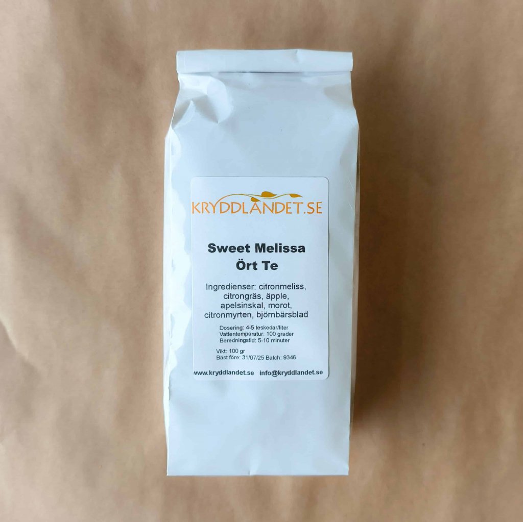 Sweet Melissa är ett enkelt, men ack så trevligt och gott ört te med naturlig sötma av äpple och morot samt toner av citrus och örter från citronmeliss, citrongräs och apelsinskal. En mycket populär smak som Kryddlandets kunder ofta väljer. Ört te innehåller inte teblad - endast örter, blad och kryddor. Det gör att det behöver dra längre tid för att nå sin fulla potential av smaker.