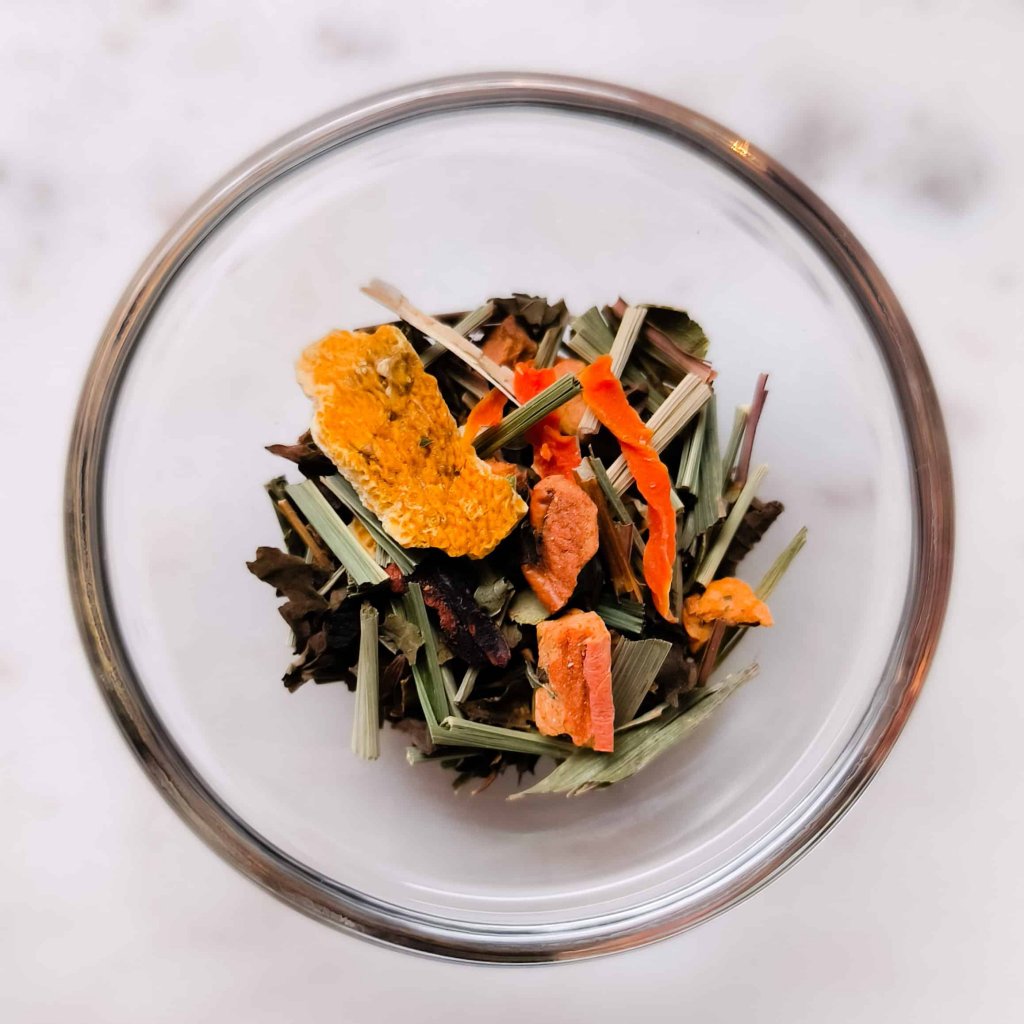 Ingredienser: citronmeliss (20 %), citrongräs, äpple, apelsinskal, morot, citronmyrten, björnbärsblad