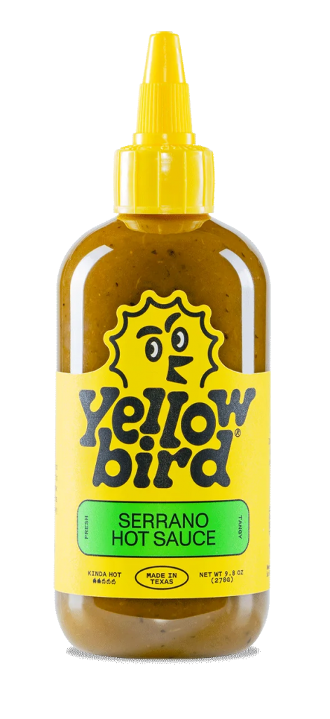 Yellowbirds Serrano sauce är en riktigt fräsch stark sås - med ingredienser som serrano, gurka och lime. Passar mycket bra till fisk, fågel, grönt, friterat och majonäs.