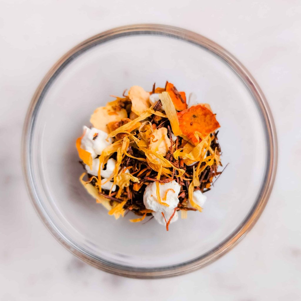 Ingredienser: rooiboste, arom, ananas (ananas, socker), citronskal, frystorkat citrongranulat (maltodextrin, citronsaft, naturlig citronolja, gelningsmedel: natriumalginat), frystorkade tangerin-apelsinbitar, ringblomma