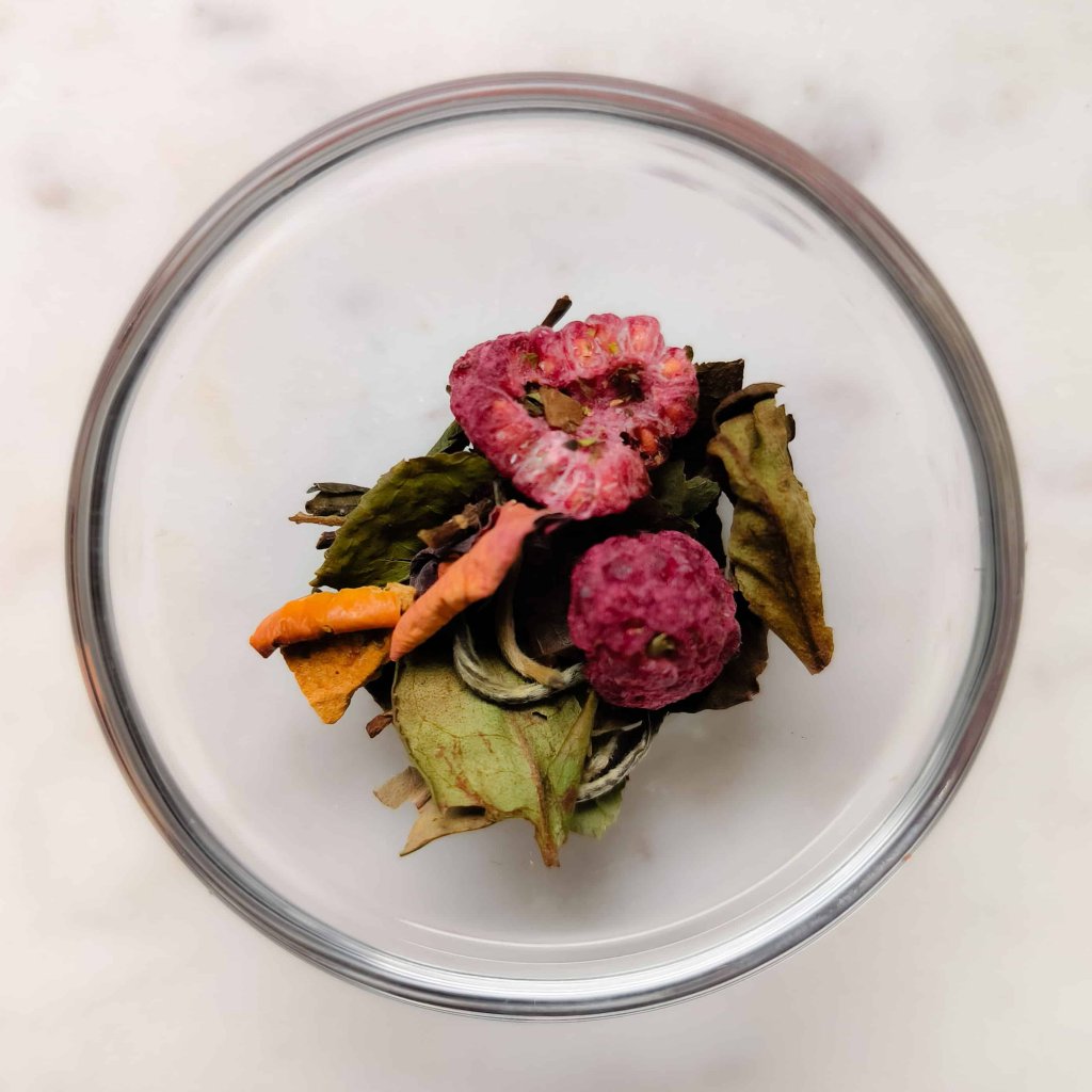 Ingredienser: äppelbitar, grönt te (30 %), vitt te (25 %), surkörsbär, bergstimjan, frystorkade hallon, kombucha-pulver (1 %) (maltodextrin, grönt te, örtblandning, rörsocker, vatten, kombuchakultur), rosenblad, frystorkade surkörsbärsbitar, frystorkade hallonbitar, arom