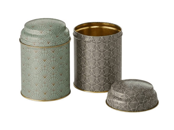 Dessa två trevliga art deco inspirerade teburkar är en mix av 20- talets glammiga uttryck och nutida mer strikta linjer. Färgsättningen är grå och turkos och burkarna rymmer ca 125 gram lösviktste/st. En perfekt present till tedrickaren!