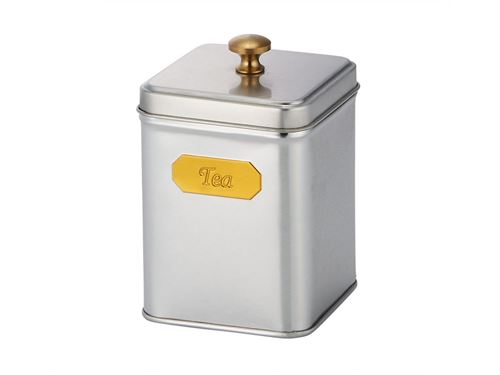 Silver & guldfärgad teburk, tillverkad plåt med guldfärgade detaljer (knopp & liten skylt) som rymmer ca 100 gram te - vilket motsvarar många tesorter ur Kryddlandets stora sortiment av te.